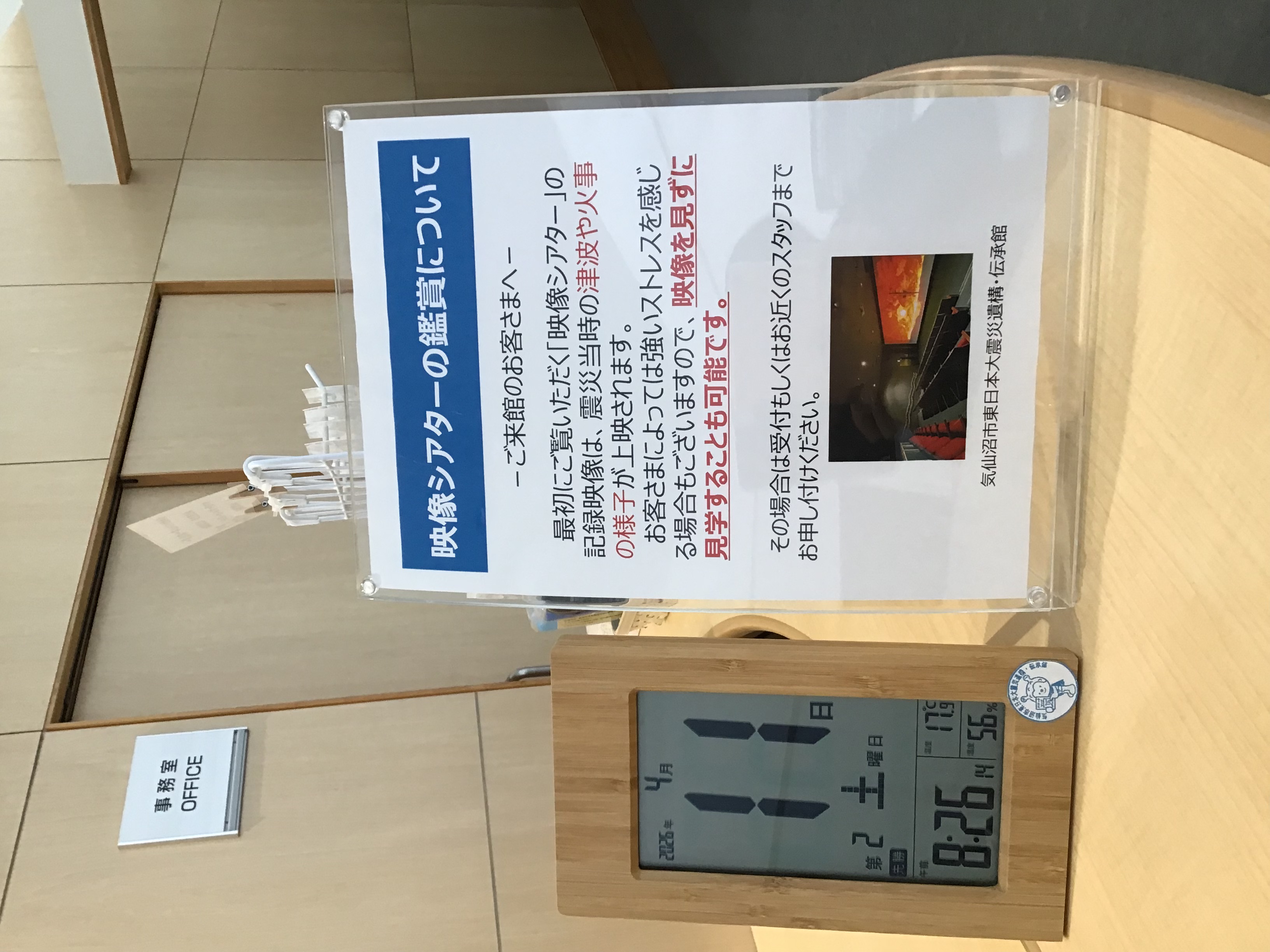 当館では見学の最初に映像シアターにて「震災時の記録映像」をご覧いただきますが、震災当時の津波や火事の様子が映し出されます。 お客さまにとっては強いストレスを感じる場合もございますので、映像を見ずに見学することも可能です。その場合は受付もしくはお近くのスタッフまでお申し付けください。