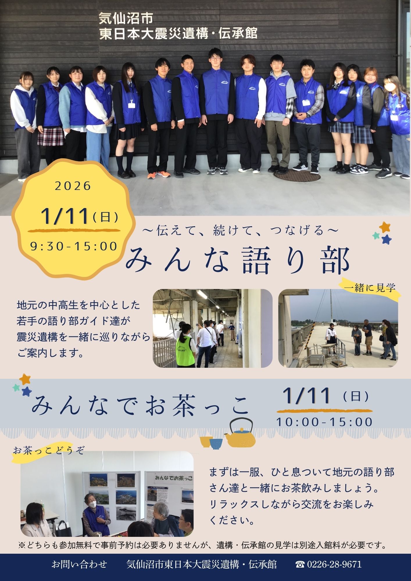 内 容:地元中高生や若手語り部メンバーが震災遺構内を一緒に巡りながらご案内します。