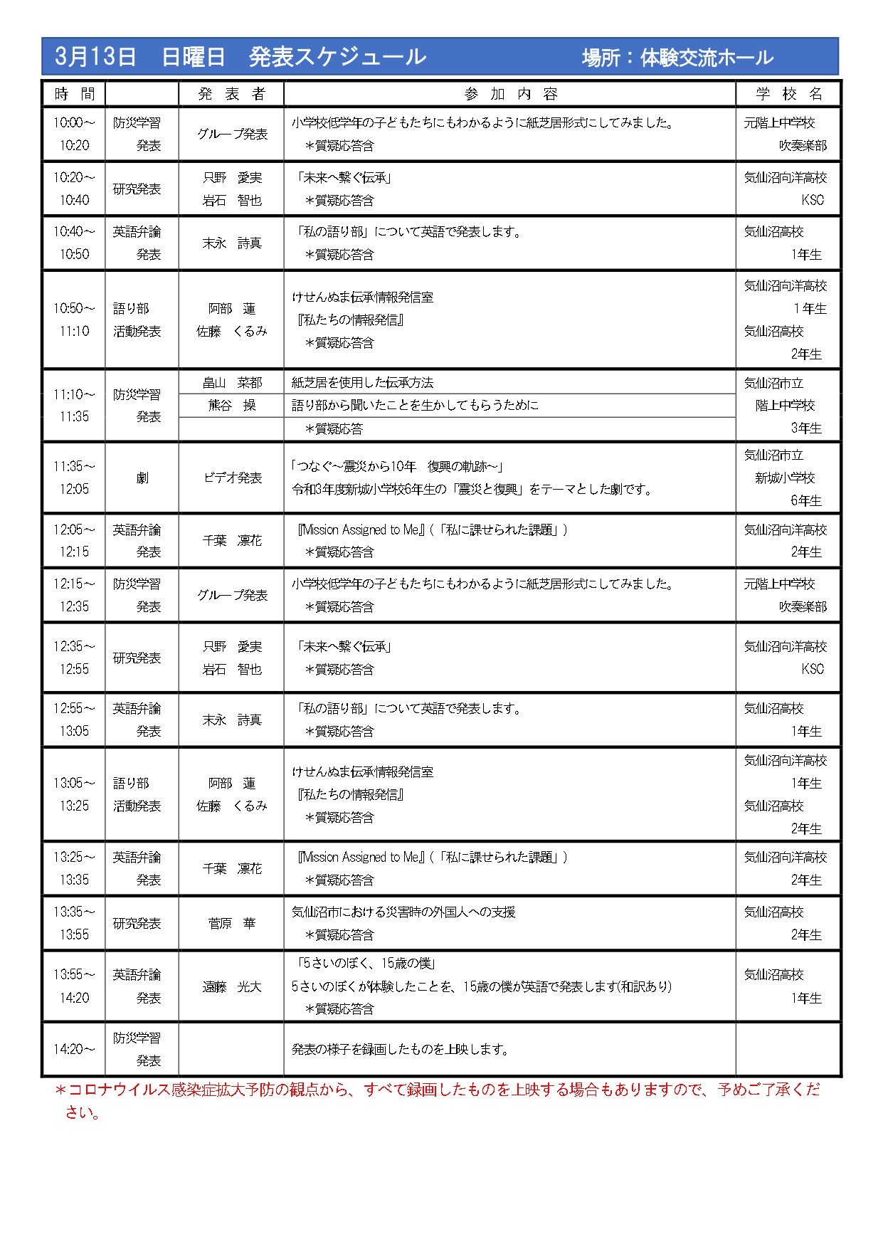 ●内容→気仙沼市内及び南三陸町内の小・中・高等学校の生徒による伝承、防災・減災、復興、災害の取り組みをそれぞれの形で発表します。