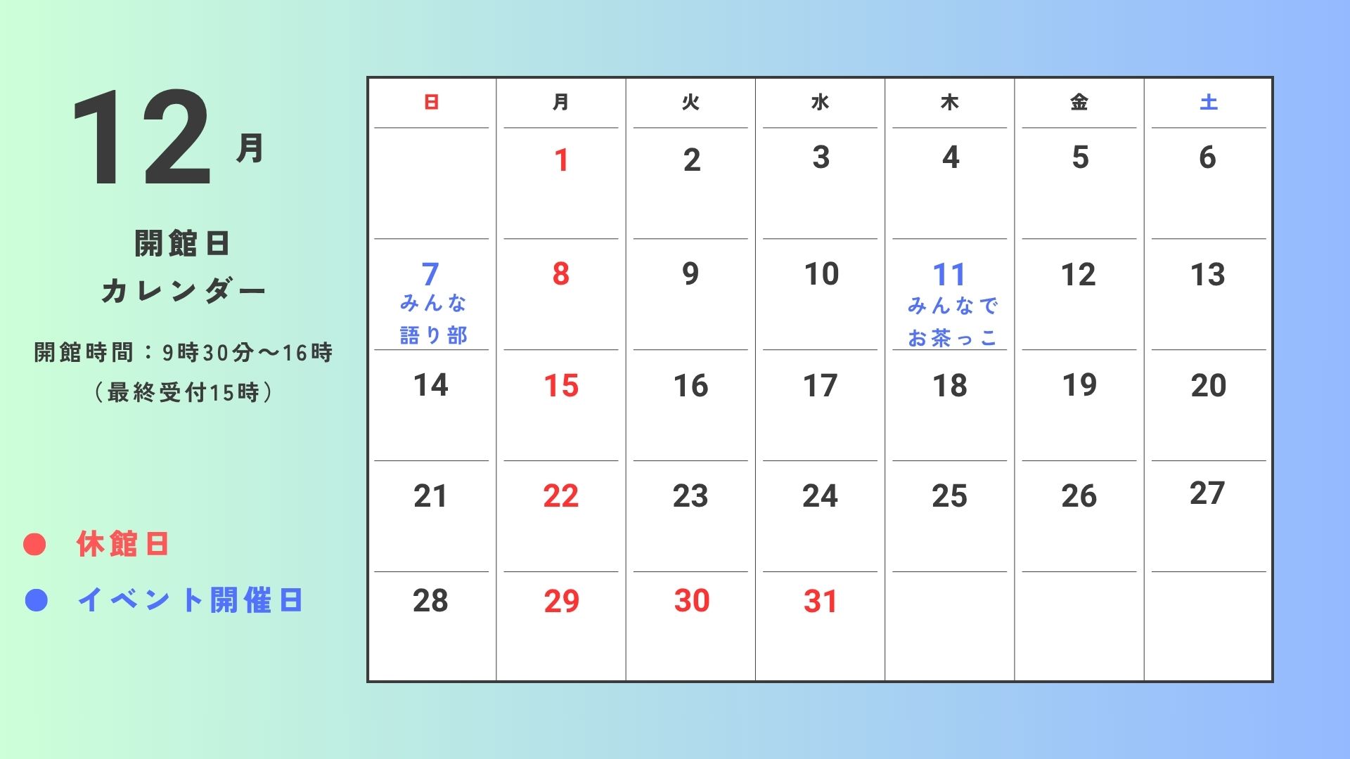12月開館情報のお知らせ